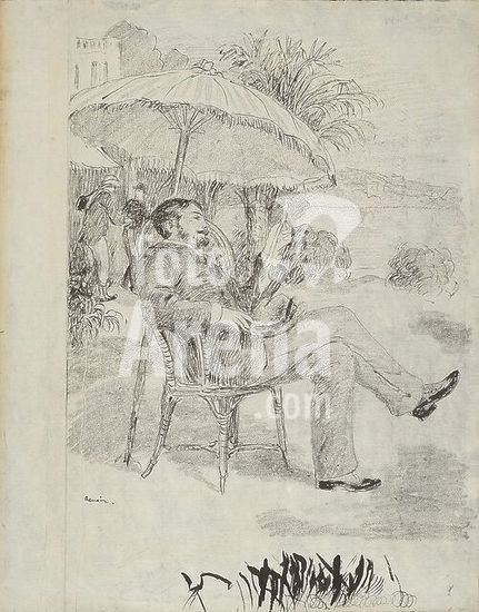 alb4159522 On the Terrace of a Hotel in Bordighera: The Painter Jean Martin Reviews his Bill. Pierre Auguste Renoir; French, 1841-1919. Date: 1883. Dimensions: 452 × 354 mm. Black conté crayon over pen and brush and black ink on ivory laid paper (discolored to cream). Origin: France. Museum: The Chicago Art Institute, USA.