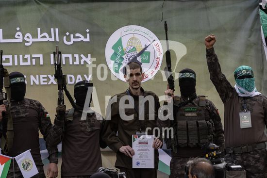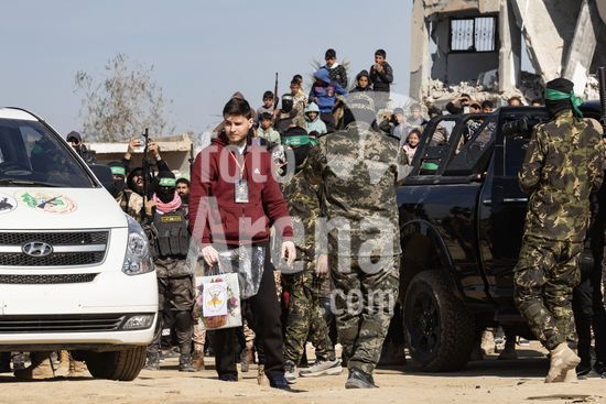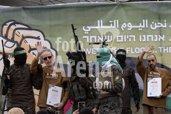 ny080225110719 Hamas fighters escort the hostages Ohad Ben Ami, left and Eli Sharabi to be exchanged in Deir al-Balah, in the Gaza Strip on Saturday, Feb. 8, 2025. In remarks effectively delivered at gunpoint, one of the three hostages exchanged on Saturday thanked Hamas fighters for ÒprotectingÓ him and called for the Israeli government to end the war. (Saher Alghorra/The New York Times/Fotoarena)