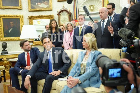 ny140425134010 Stephen Miller, right, the deputy White House chief of staff, speaks as President Donald Trump meets with President Nayib Bukele of El Salvador in the Oval Office of the White House in Washington, on Monday, April 14, 2025. President Trump met with President Bukele as the administration ramps up its use of a notorious Salvadoran prison for holding migrants deported by the U.S. Seated from left: Vice President JD Vance, Secretary of State Marco Rubio, Attorney General Pam Bondi. (Eric Lee/The New York Times/Fotoarena)