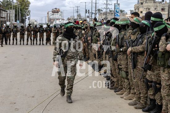 ny080225110711 Hamas fighters gather for an exchange of hostages in Deir al-Balah, in the Gaza Strip on Saturday, Feb. 8, 2025. In remarks effectively delivered at gunpoint, one of the three hostages exchanged on Saturday thanked Hamas fighters for ÒprotectingÓ him and called for the Israeli government to end the war. (Saher Alghorra/The New York Times/Fotoarena)