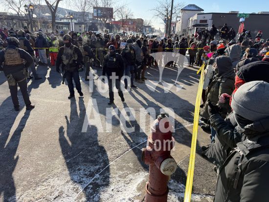 ny240126135711 Demonstrators and civilians surround a perimeter held by federal agents near the intersection of 26th Street and Nicollet Avenue in Minneapolis, where federal law enforcement agents shot a person earlier on Saturday, Jan. 24, 2026. The scene was cordoned off with crime scene tape, as dozens of protesters, some wearing gas masks and goggles, blew whistles. ICE agents from Enforcement and Removal Operations were on site, as were several agents wearing U.S. Bureau of Prison Uniforms. (David Guttenfelder/The New York Times/Fotoarena)