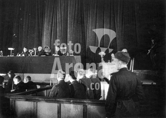 975_05_SOV-B-KH44 World war 2, december 15, 1943, still from a film on the kharkov trial produced by artkino, judges, prisoners docket, and guard.