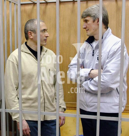975_19_TASS-D-S003B826 Former yukos ceo mikhail khorodkovsky (left) and leading yukos shareholder platon lebedev seen behind bars, they were found guilty under seven articles of the russian criminal code and sentenced to 9 years imprisonment, moscow, russia, june 23, 2004.