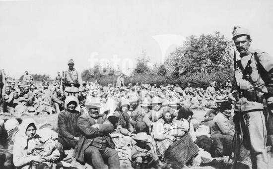 990_05_4-WWI-POW-Allied_2HR Europe: c. 1915 Captured Russian prisoners being watched by Austrian guards. Some of the civilian Polish people who fled from the Russians are in the foreground and have placed themselves under the protection of the Austrians.