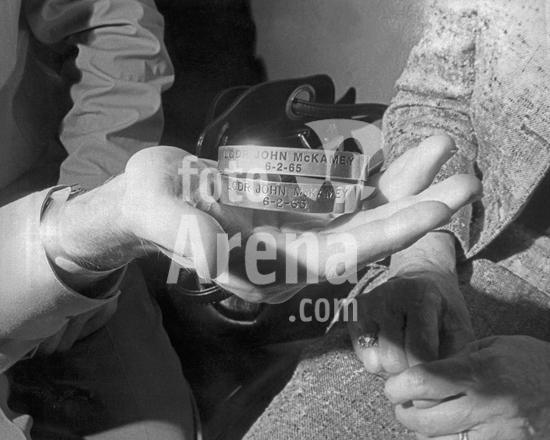 990_05_4-War-VN-US-POW_6HR Oakland, California: c. 1973 Navy Commander John McKamey accepts the POW bracelets from his parents during their reunion at the Naval Hospital in Oakland after his release from North Vietnam..