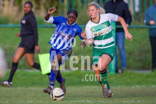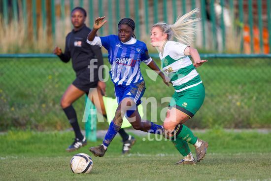2836377 Londres, Reino Unido. 2 de novembro de 2025. Georgie Lewin (6) do QPR e Hana Lalani (9) do Actonians disputam a bola durante a partida da FA WNL SED1 entre Actonians LFC e QPR FC Women no North Greenford FC em Londres, Inglaterra. (Mike Turner / SPP) (Mike Turner / SPP)