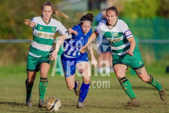 2836348 Londres, Reino Unido. 2 de novembro de 2025. Ellie Searle (3) e Emily Hill (5) do QPR disputam a bola com Lilian Ruttgers (10) do Actonians durante a partida da FA WNL SED1 entre Actonians LFC e QPR FC Women no North Greenford FC em Londres, Inglaterra. (Mike Turner / SPP) (Mike Turner / SPP)