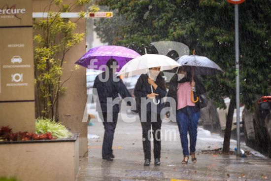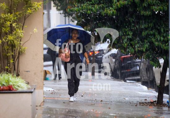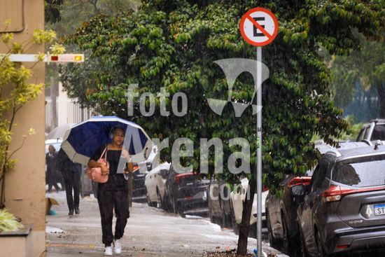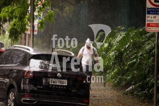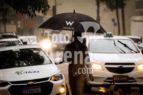 2844318 Uma forte chuva atinge a cidade de São Paulo na tarde desta segunda-feira (17). Na foto pessoa se protege da chuva na região da Vila Olímpia na zona sul da capital paulista.