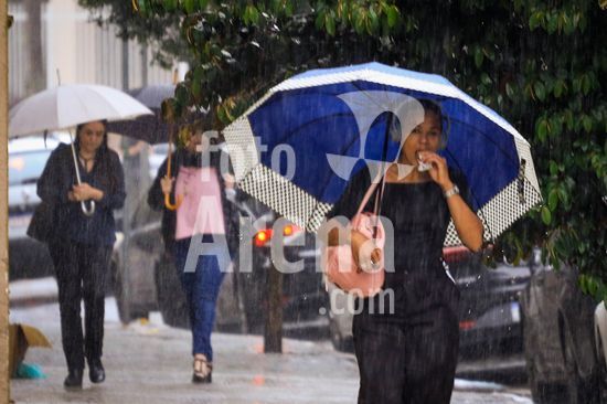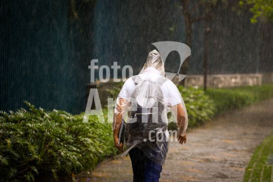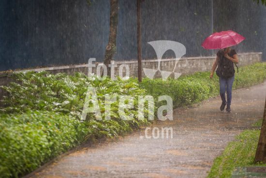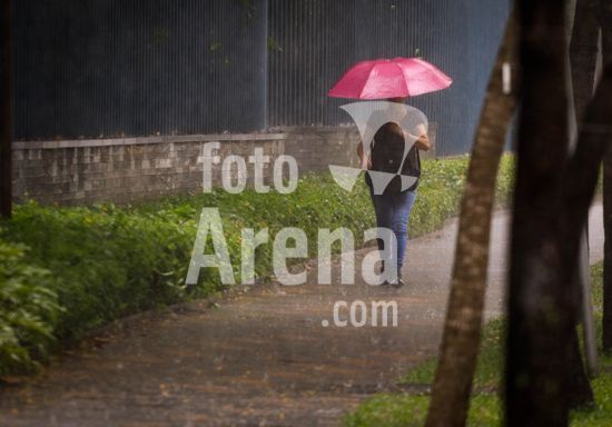 2844323 Uma forte chuva atinge a cidade de São Paulo na tarde desta segunda-feira (17). Na foto pessoa se protege da chuva na região da Vila Olímpia na zona sul da capital paulista.