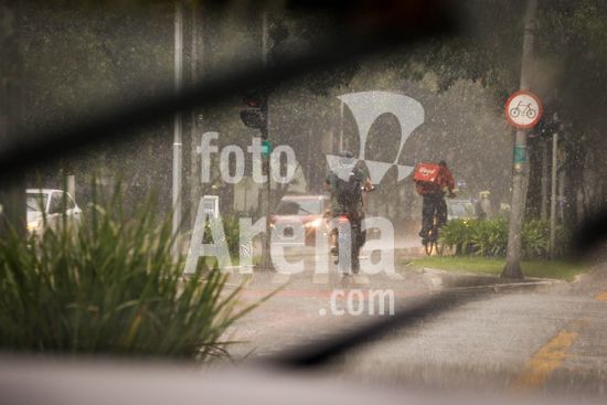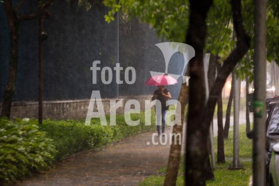 2844313 Uma forte chuva atinge a cidade de São Paulo na tarde desta segunda-feira (17). Na foto pessoa se protege da chuva na região da Vila Olímpia na zona sul da capital paulista.