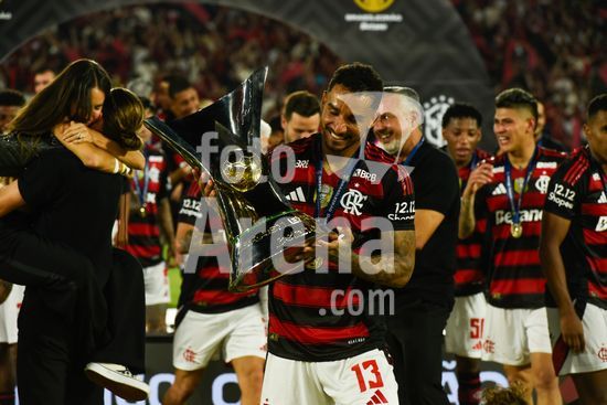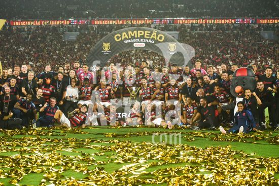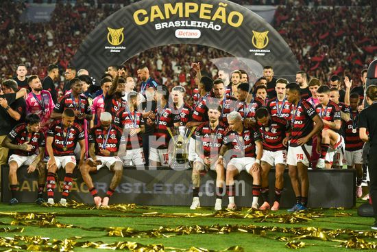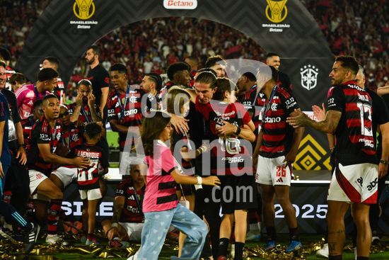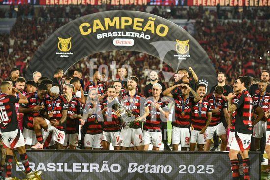 2853038 RIO DE JANEIRO, BRASIL - O time do Flamengo posa para uma foto com o troféu após conquistar o campeonato na partida entre Flamengo e Ceará, válida pelas Eliminatórias do Brasileirão 2025, realizada no Estádio do Maracanã em 3 de dezembro de 2025, no Rio de Janeiro, Brasil.
