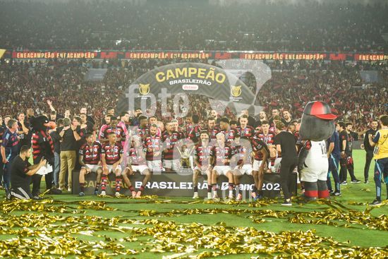 2853024 RIO DE JANEIRO, BRASIL - O time do Flamengo posa para uma foto com o troféu após conquistar o campeonato na partida entre Flamengo e Ceará, válida pelas Eliminatórias do Brasileirão 2025, realizada no Estádio do Maracanã em 3 de dezembro de 2025, no Rio de Janeiro, Brasil.