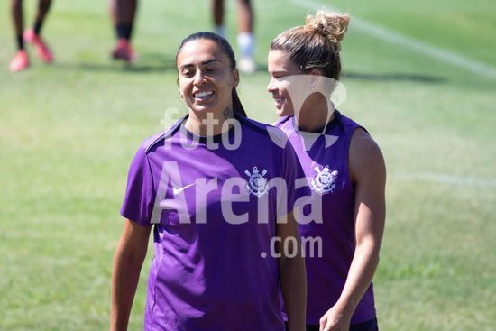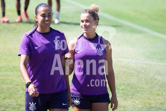 2867989 O elenco feminino do Corinthians abre parte do treino e as novas contratações do time dão coletiva de imprensa na manhã desta quarta-feira (14) no CT Joaquim Grava, em São Paulo, SP. Na foto, Andressa Alves e Tamires.
