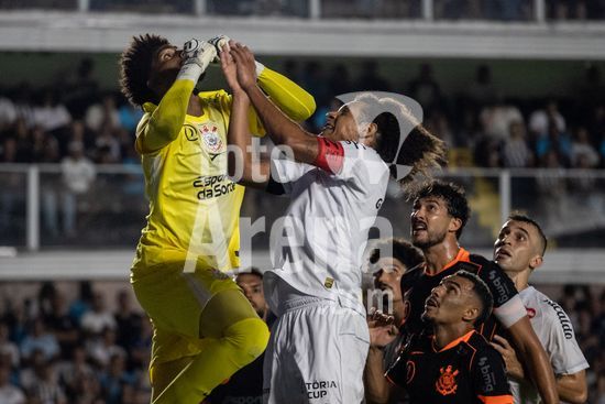 2872080 Hugo Souza (Corinthians) e Willian Arão (Santos) durante a partida entre Santos e Corinthians, válida pela 4ª rodada do Paulistão, realizada na noite desta quinta (22) na Vila Belmiro em Santos, SP.