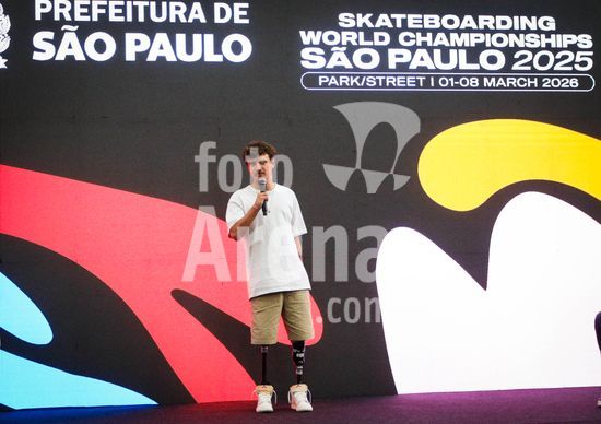 2896535 O prefeito da cidade de São Paulo, Ricardo Nunes concede entrevista coletiva nesta segunda-feira (02) no Hall da prefeitura, sobre mundial de Skate em São Paulo (STU) nas modelidades Street e Park. Participaram do evento, o CEO da STU Skateboard, Diogo Castelão, o secretário de Esportes do município de São Paulo, Rogério Lins, a skatista e Letícia Bufoni e o Presidente do Word Skate, Sabatino Aracu. Na foto, o paraskatista brasileiro, hexacampeão do Circuito STU de Paraskate (Park), Vini Sardi.