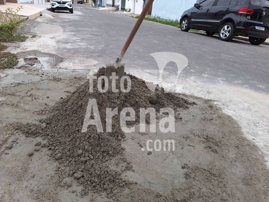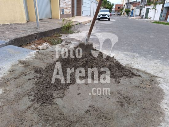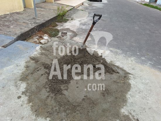 2862438 Enxada com cimento na rua do bairro Parque Iracema em Fortaleza, capital cearense.