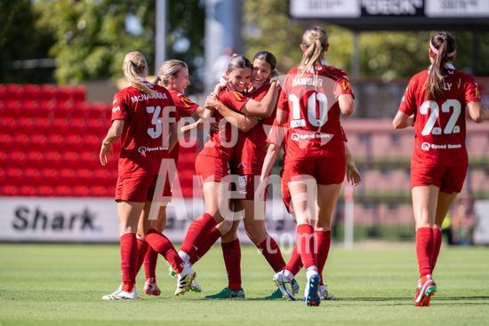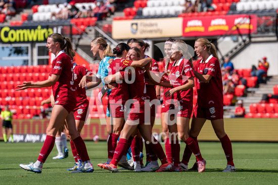 2863003 Jogadoras do Adelaide United comemoram o gol de Emily Hodgson (2 Adelaide United) durante a partida da Ninja A-League Feminina entre Adelaide United e Western Sydney Wanderers no Coopers Stadium em Adelaide, Australia. (Noe Llamas / SPP)