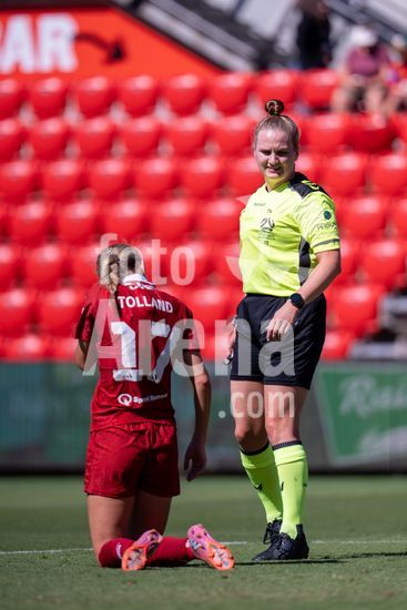 2863016 A arbitra Izzy Cooper verifica o estado de Zoe Tolland (17 Adelaide United) durante o jogo da Ninja A-League Feminina entre Adelaide United e Western Sydney Wanderers no Coopers Stadium em Adelaide, Australia. (Noe Llamas / SPP)