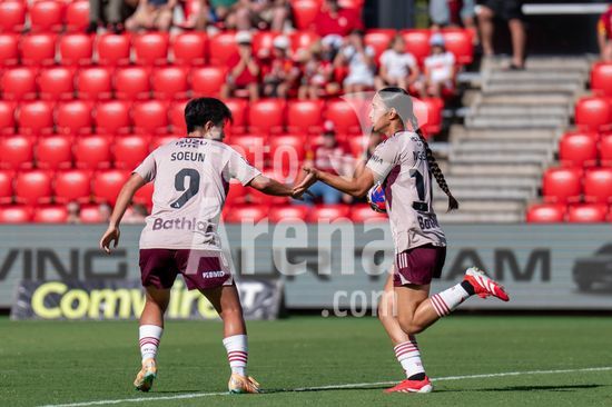 2863027 Allyssa Ng-Saad (17 Western Sydney Wanderers) e Kim Soeun (9 Western Sydney Wanderers) comemoram o primeiro gol de suas equipes durante a partida da Ninja A-League Feminina entre Adelaide United e Western Sydney Wanderers no Coopers Stadium em Adelaide, Australia. (Noe Llamas / SPP)