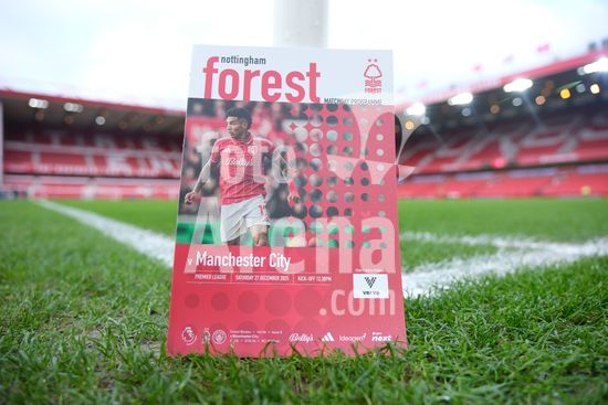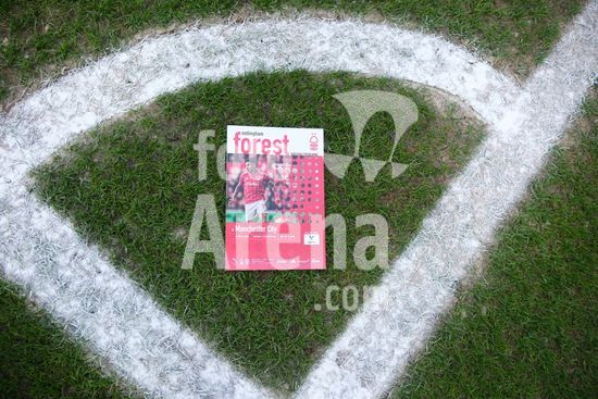 2863044 Programa do jogo exibido no gramado antes do pontape inicial durante a partida de futebol da Premier League entre Nottingham Forest e Manchester City no City Ground em Nottingham. (Paul Bonser/Sports Press Photo / SPP)