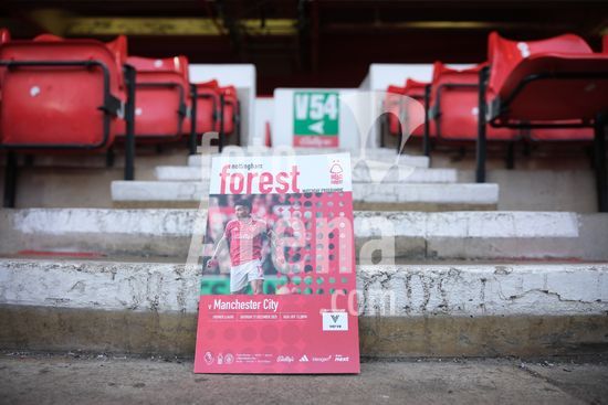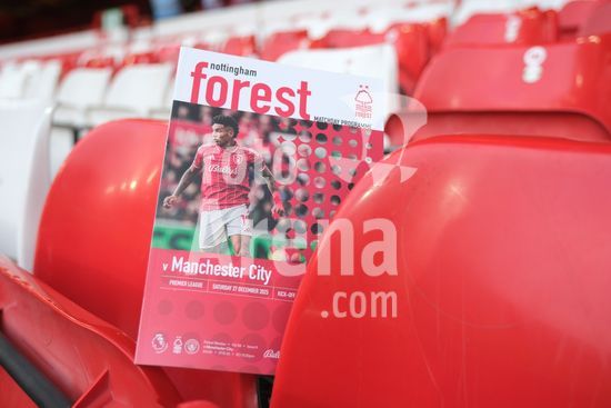 2863047 Programa do jogo nas arquibancadas antes do pontape inicial durante a partida de futebol da Premier League entre Nottingham Forest e Manchester City no City Ground em Nottingham. (Paul Bonser/Sports Press Photo / SPP)