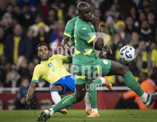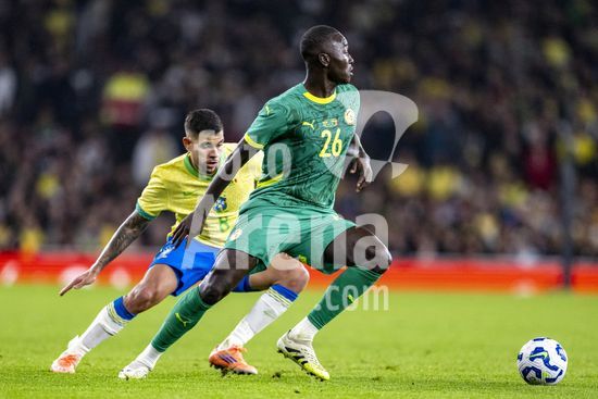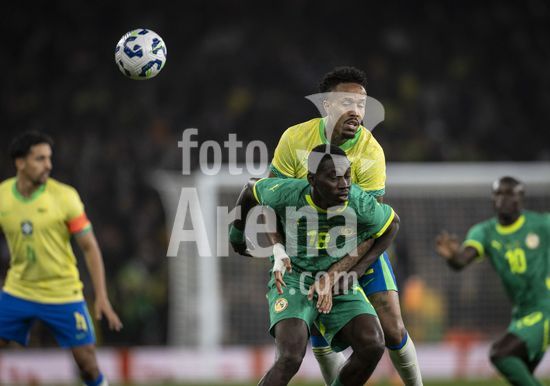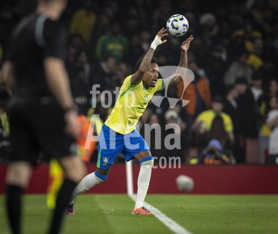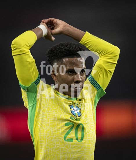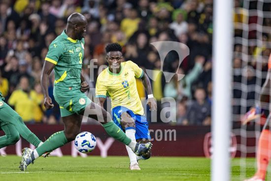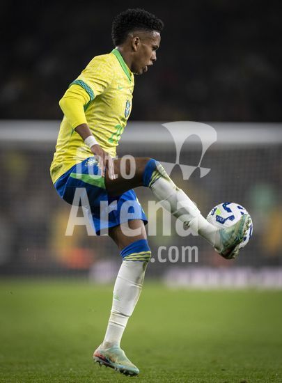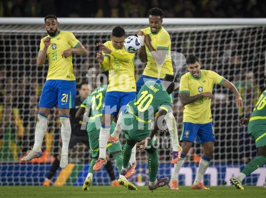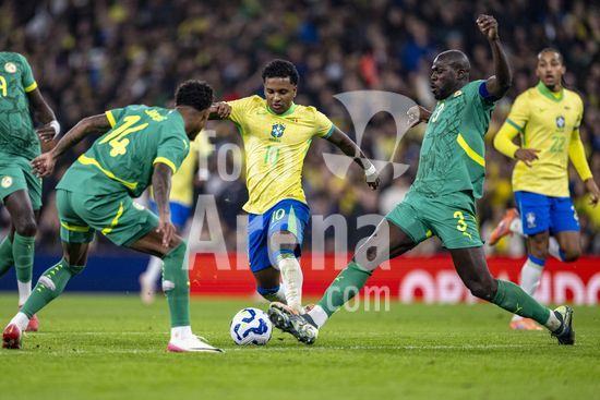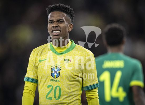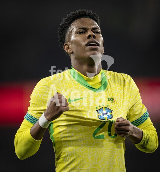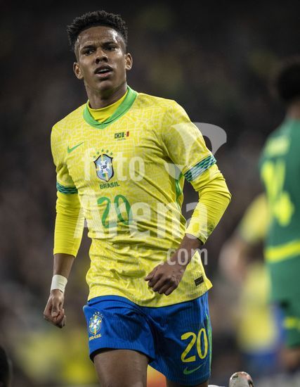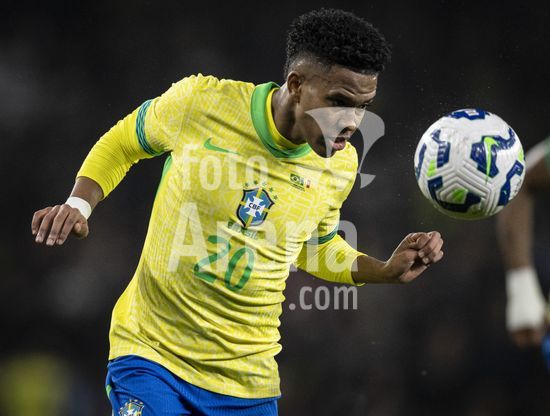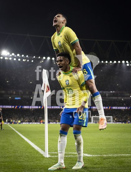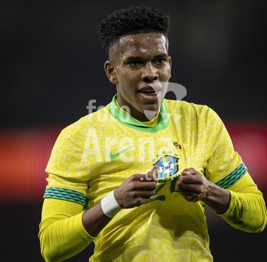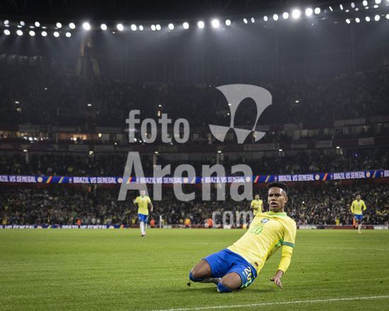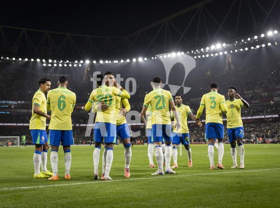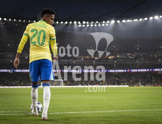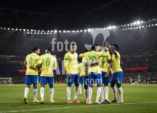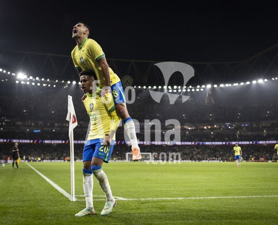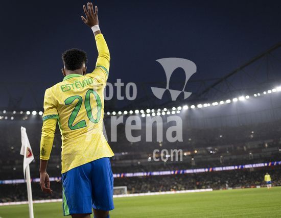 LONDRES, INGLATERRA - 15 DE NOVEMBRO: Estevao, do Brasil, comemora com seus companheiros de equipe apos marcar o primeiro gol do time durante o amistoso internacional entre Brasil e Senegal, no Emirates Stadium, em 15 de novembro de 2025, em Londres, Inglaterra. (Foto de Ricardo Nogueira/Sports Press Photo/SPP)