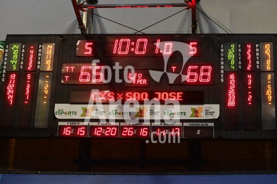 2925890 Imagens da partida de basquete entre o Caxias do Sul Basquete e o São José, válida pelo NBB 25/26, disputada no Ginásio do SESI, em Caxias do Sul. Placar com o resultado do jogo. Caxias do Sul, RS (15).