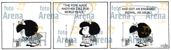 0096en TIRA MAFALDA, CÓDIGO ORIGINAL 0096, INGLÊS, EDICIONES DE LA FLORDiálogoRadio: "The people made another call for world peace."Mafalda: And got an engaged signal, as usual!