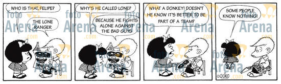 0133en TIRA MAFALDA, CÓDIGO ORIGINAL 0133, INGLÊS, EDICIONES DE LA FLORDiálogoMafalda: Who is that, Felipe?Felipe: The lone ranger.Mafalda: Why's he called lone?Felipe: Because he fights alone against the bad guys.Mafalda: What a donkey! Doesn't he know it's better to be part of a team? some people know nothing!