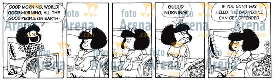 0135en TIRA MAFALDA, CÓDIGO ORIGINAL 0135, INGLÊS, EDICIONES DE LA FLORDiálogoMafalda: Good morning, world! Goos morning, al the good people on earth! Guuud norning! If you don't say hello, the bad people can gat offended.