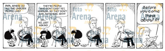0482en TIRA MAFALDA, CÓDIGO ORIGINAL 0482, INGLÊS, EDICIONES DE LA FLORDiálogoMafalda: Papa, where do all the unborn people live?Papa: They're people who don't exist yet, Mafalda. So they don't live anywhere. Why?Mafalda: Oh, no, just asking.Papa: Before you come think about it!
