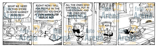 0483en TIRA MAFALDA, CÓDIGO ORIGINAL 0483, INGLÊS, EDICIONES DE LA FLORDiálogoManolito: What we need in this store is good market research. Right now I will ask people in the street: do you shop at Don Manolo's? Yes or no? All the ones who say yes, I'll put in this column, and the ones who answer no...