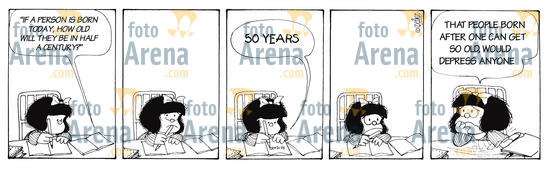 0489en TIRA MAFALDA, CÓDIGO ORIGINAL 0489, INGLÊS, EDICIONES DE LA FLORDiálogoMafalda: "If person is born today, how old will they be in half a century?" 50 years. That people born after one can get so old, would depress anyone.