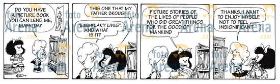0576en TIRA MAFALDA, CÓDIGO ORIGINAL 0576, INGLÊS, EDICIONES DE LA FLORDiálogoSusanita: do you have a picture book you can lend me, Mafalda?Mafalda: This one that my father brought.Susanita: "Exemplary lives". And what is it?Mafalda: Picture stories of the lives of people who did great things for the good of mankind.Susanita: Thanks. I want to enjoy myself, not to feel insignificant.
