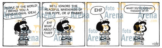 0589en TIRA MAFALDA, CÓDIGO ORIGINAL 0589, INGLÊS, EDICIONES DE LA FLORDiálogoMafalda: People of the world! I bring you a sensational idea! We'll ignore the peaceful warnings of the pope, u thant! Eh? What about that? Eh? What? You've already thought of it?