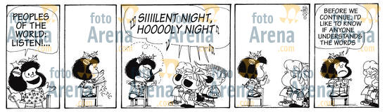 0593en TIRA MAFALDA, CÓDIGO ORIGINAL 0593, INGLÊS, EDICIONES DE LA FLORDiálogoMafalda: Peoples of the world: Listen!susanita, Miguelito and Manolito: Siiiiilent night hoooly night.Mafalda: Before we continue, I'd like to know if anyone understands the words.
