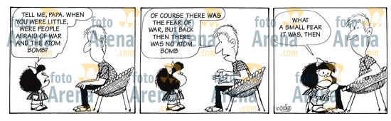 0613en TIRA MAFALDA, CÓDIGO ORIGINAL 0613, INGLÊS, EDICIONES DE LA FLORDiálogoMafalda: Tell me, papa. When you were little, were people afraid of war and the atom bomb?Papa: Of course there was the fear of war, but back then there was no atom bomb.Mafalda: What a small fear it was, then.