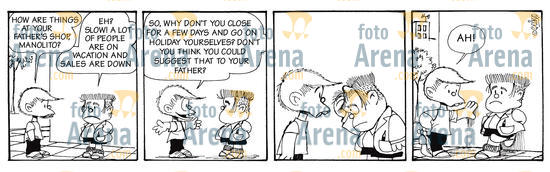0631en TIRA MAFALDA, CÓDIGO ORIGINAL 0631, INGLÊS, EDICIONES DE LA FLORDiálogoFelipe: How are things at your father's shop, Manolito?Manolito: Eh? Slow! A lot of people are on vacation and sales are down.Felipe: So, why don't you close for a few days and go on holuday yourselves? Don't you think you could suggest that to your father?Felipe: Ah!