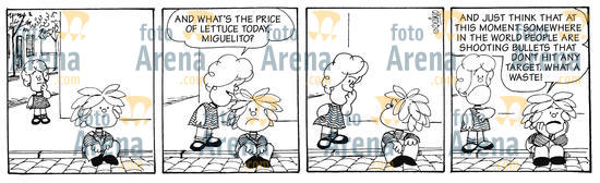 0633en TIRA MAFALDA, CÓDIGO ORIGINAL 0633, INGLÊS, EDICIONES DE LA FLORDiálogoSusanita: And what's the price of lettuce today, Miguelito?Miguelito: And just think that at this moment somewhere in the world people are shooting bullets that don't hit any target. What a waste!