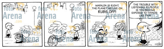 0635en TIRA MAFALDA, CÓDIGO ORIGINAL 0635, INGLÊS, EDICIONES DE LA FLORDiálogoMiguelito: Mafalda is right. The planet we live on rubs off!Felipe: The trouble with listening to people is you become exposed to things like that.
