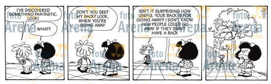 0640en TIRA MAFALDA, CÓDIGO ORIGINAL 0640, INGLÊS, EDICIONES DE LA FLORDiálogoMiguelito: I've discovered something fantastic. Look!Mafalda: What?Miguelito: Don't you see? My back? Look, when you're going away. Isn't it surprising how useful your back is for going away? I don't know how people could go away if they didn't have a back.