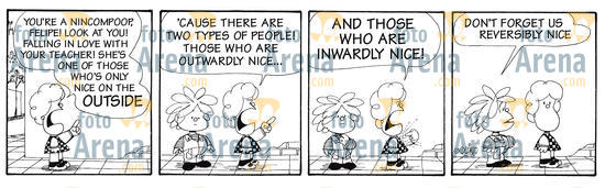 0671en TIRA MAFALDA, CÓDIGO ORIGINAL 0671, INGLÊS, EDICIONES DE LA FLORDiálogoSusanita: You're a nincompoop, Felipe! Look at you falling in love with your teacher! She's one of those who's only nice on the outside. 'Cause there are two types of people! Those who are outwardly nice and those who are inwardly nice!Miguelito: Don't forget us reversibly nice.