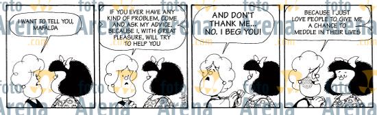 0800en TIRA MAFALDA, CÓDIGO ORIGINAL 0800, INGLÊS, EDICIONES DE LA FLORDiálogoSusanita: I want to tell you, Mafalda. If you ever have any kind of problem, come and ask my advice, because I, with great pleasure, will try to help you. And don't thank me. No. I beg you! Because I just love people to give me a chance to meddle in theis lives.