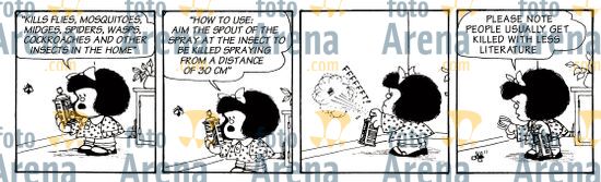 0902en TIRA MAFALDA, CÓDIGO ORIGINAL 0902, INGLÊS, EDICIONES DE LA FLORDiálogoMafalda: "Kills flies, mosquitoes, midges, spiders, wasps, cockroaches and other insects in the home. How to see: aim the spout of the spray at the insect to be killed spraying from a distance of 30cm". Please note people usualy get killed with less literature.
