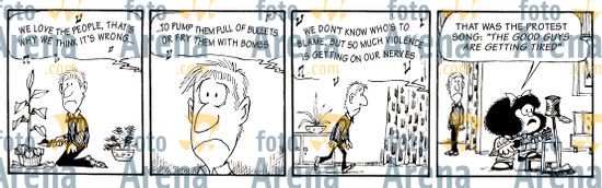 0941en TIRA MAFALDA, CÓDIGO ORIGINAL 0941, INGLÊS, EDICIONES DE LA FLORDiálogoMafalda: "We love the people, that's why we think it's wrong to pump them full of bullets or gry them with bombs. We don't know who's to blame, but so much violence is getting on our nerves". That was the protest song: "The good guys are getting tired".