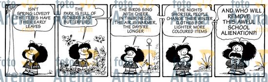 0986en TIRA MAFALDA, CÓDIGO ORIGINAL 0986, INGLÊS, EDICIONES DE LA FLORDiálogoMafalda: Isn't spring lovely? The trees have their early leaves. The park is full of flowers and butterflies. The birds sing with cheer in their nest, the air is warmer, the days're longer. The nights shorter, people change their winter clothes for lighter more coloured items. And who will remove this awful school alienation?!
