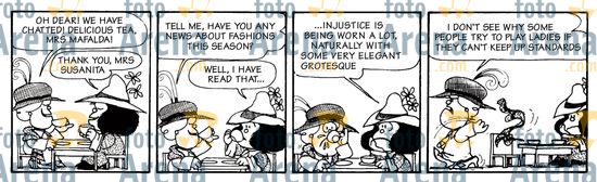 0990en TIRA MAFALDA, CÓDIGO ORIGINAL 0990, INGLÊS, EDICIONES DE LA FLORDiálogoSusanita: Oh dear! We have chatted! Delicious tea, Mrs. Mafalda!Mafalda: Thank you, Mrs. Susanita.Susanita: Tell me, have you any news about fashions this season?Mafalda: Well, I have read that injustice is being worn a lot, naturally with some very elegant grotesque.Susanita: I don't see why some people try to play ladies if they can't keep up standards.