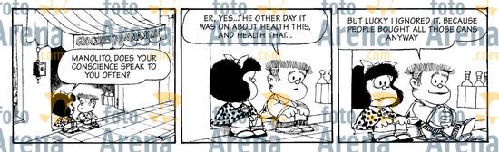 1011en TIRA MAFALDA, CÓDIGO ORIGINAL 1011, INGLÊS, EDICIONES DE LA FLORDiálogoMafalda: Manolito, does your conscience speak to you often?Manolito: Er, yes... The other day it was on about health this, and health that, but lucky I ignored it, because people bought all those cans anyway.