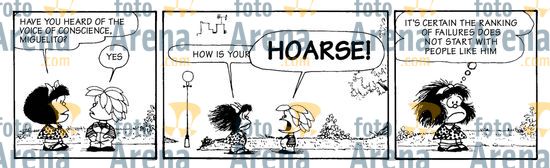 1012en TIRA MAFALDA, CÓDIGO ORIGINAL 1012, INGLÊS, EDICIONES DE LA FLORDiálogoMafalda: Have you heard of the voice of conscience, Miguelito?Miguelito: Yes.Mafalda: How is your...Miguelito: HOARSE!Mafalda: It's certain the ranking of failures does not start with people like him.