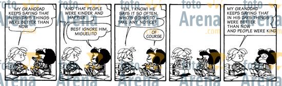 1015en TIRA MAFALDA, CÓDIGO ORIGINAL 1015, INGLÊS, EDICIONES DE LA FLORDiálogoMiguelito: My granddad keeps saying that in his days things were better than now. And that people were kinder and happier.Mafalda: Best ignore him, Miguelito.Miguelito: Yeh, I know! He says it so often, who's going to take any notice?Mafalda: Of course.Miguelito: My dranddad keeps saying that in his days things were better than now and people were kind...